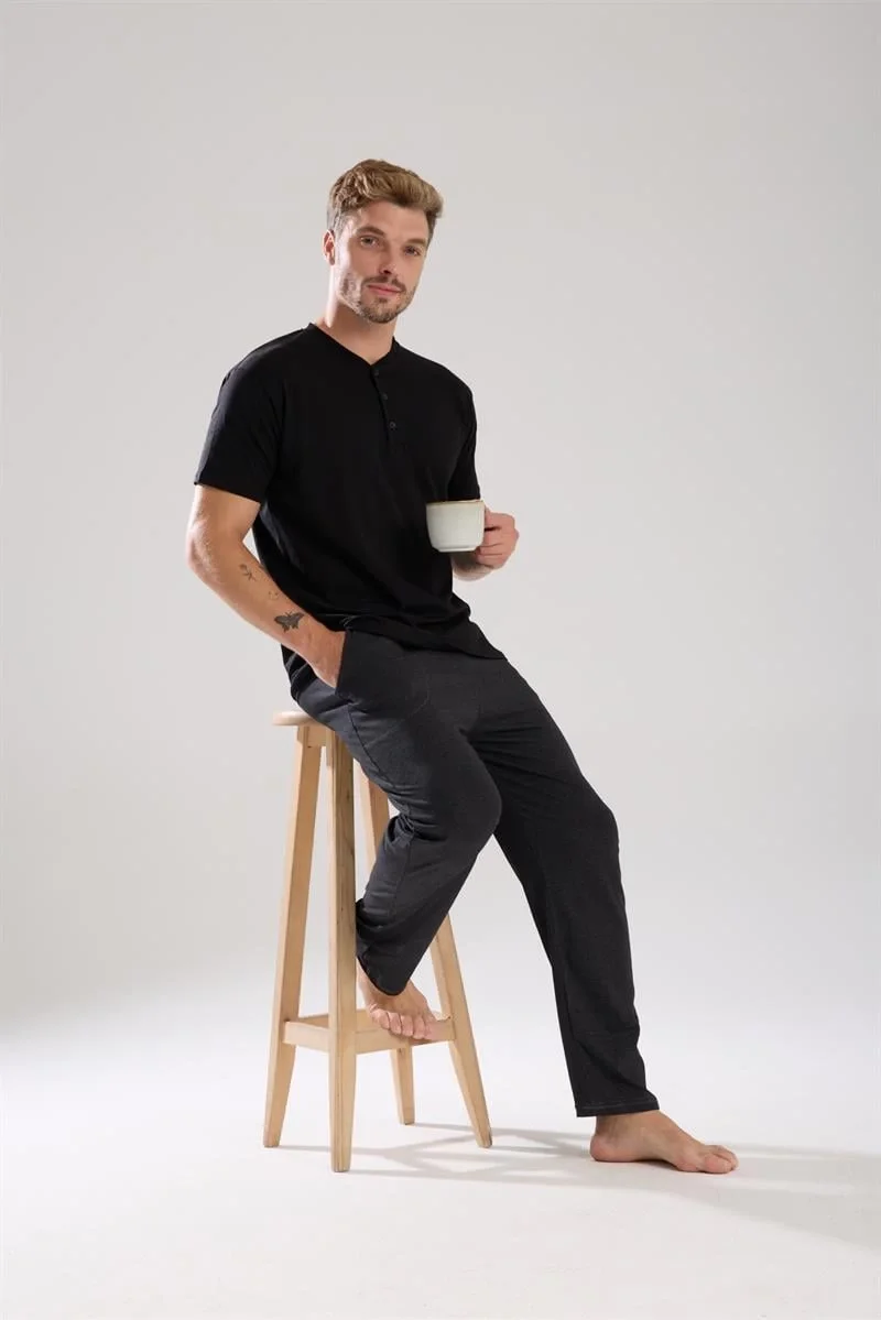 Şıklığından ödün vermeyen erkeklerin tercihi olan Füme Düğmeli Yaka Kısa Kol Pijama Takımı, evde geçirdiğiniz zamanlarda da konforu ön planda tutar.