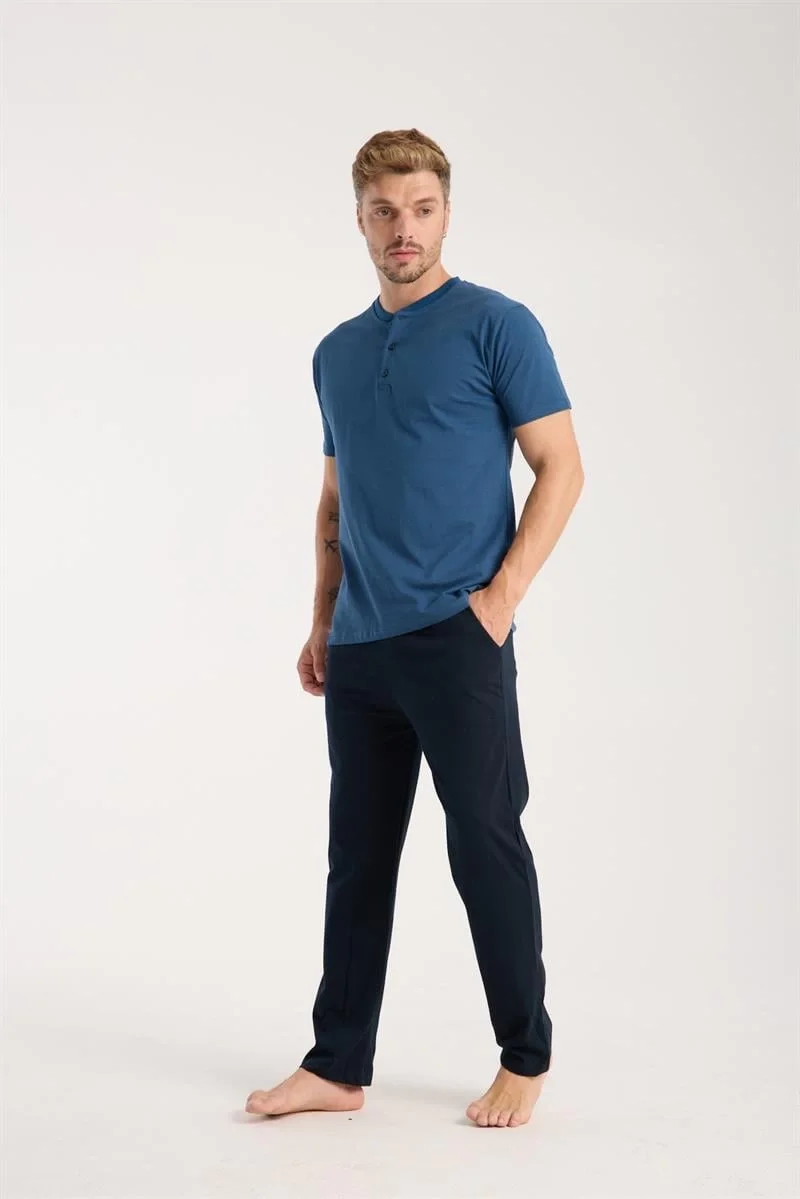 Erkek İndigo Düğmeli Yaka Kısa Kol Pijama Takımı ile hem şık hem de rahat bir gece geçirebilir, günün yorgunluğunu üzerinizden atabilirsiniz.