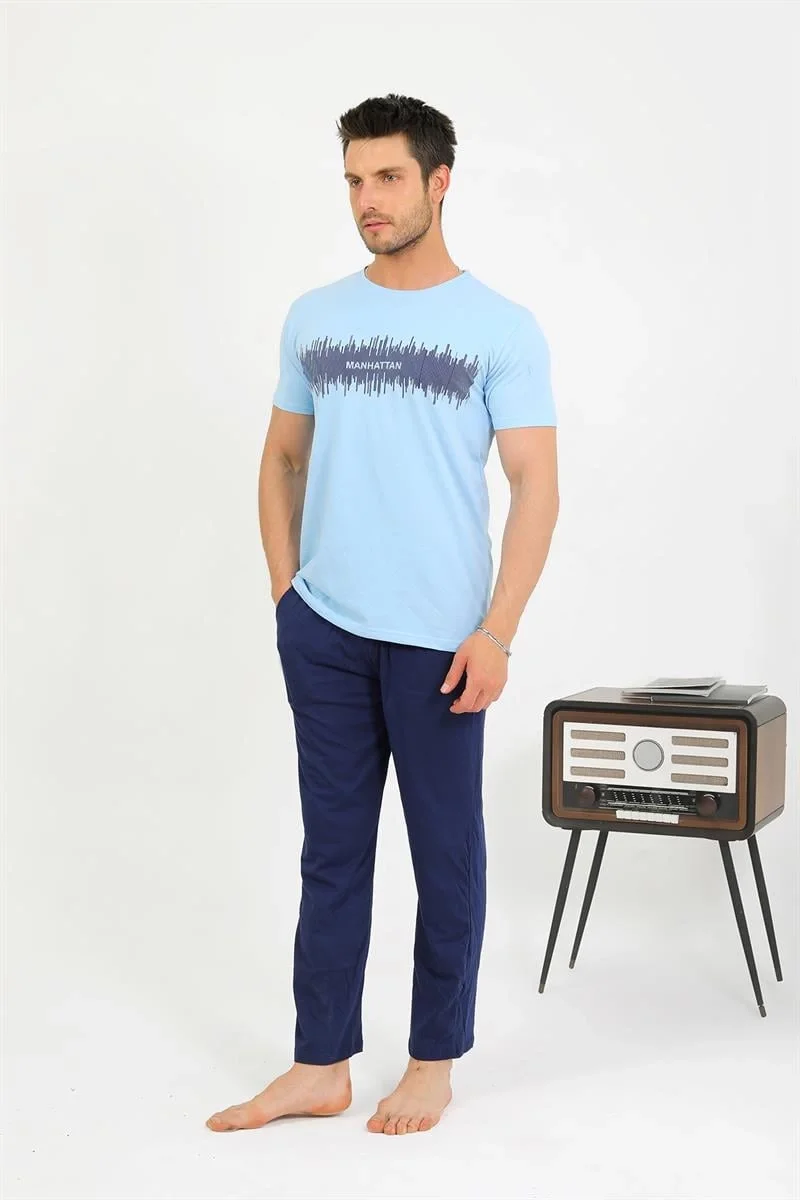 Çamaşır Kenti'nin mavi rengindeki erkek pamuk kısa kol pijama takımıyla rahatlığı ve tarzı bir arada bulacaksınız.