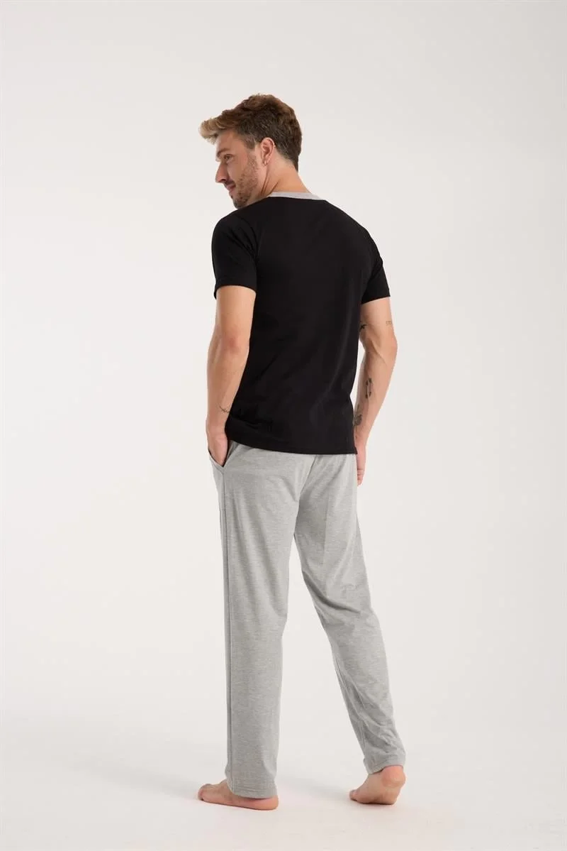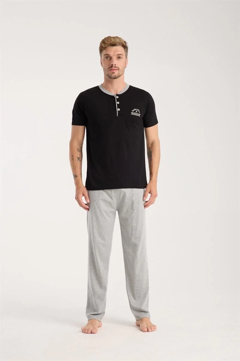 Şıklığı ve konforu bir arada sunan erkek siyah düğmeli yaka kısa kol pijama takımı, günlük kullanım için ideal bir seçenektir.