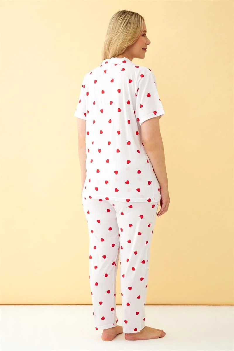 Çamaşır Kenti'nin büyük beden kadın pijama takımı, şık ve konforlu tasarımıyla dikkat çekiyor. Beyaz ve kırmızı renklerin uyumuyla öne çıkan pijama takımı, kalp desenleriyle de oldukça şirin bir görünüme sahip.
