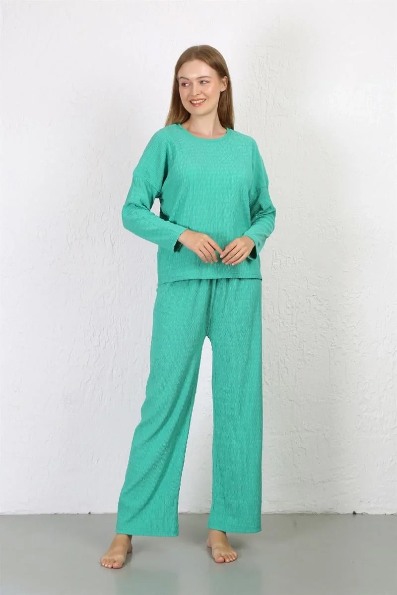 Şıklığı ve konforu aynı anda yaşamak isteyen kadınlar için Çamaşır Kenti Yeşil Bürümcük Kumaş Pijama Takımı harika bir seçim olacaktır.