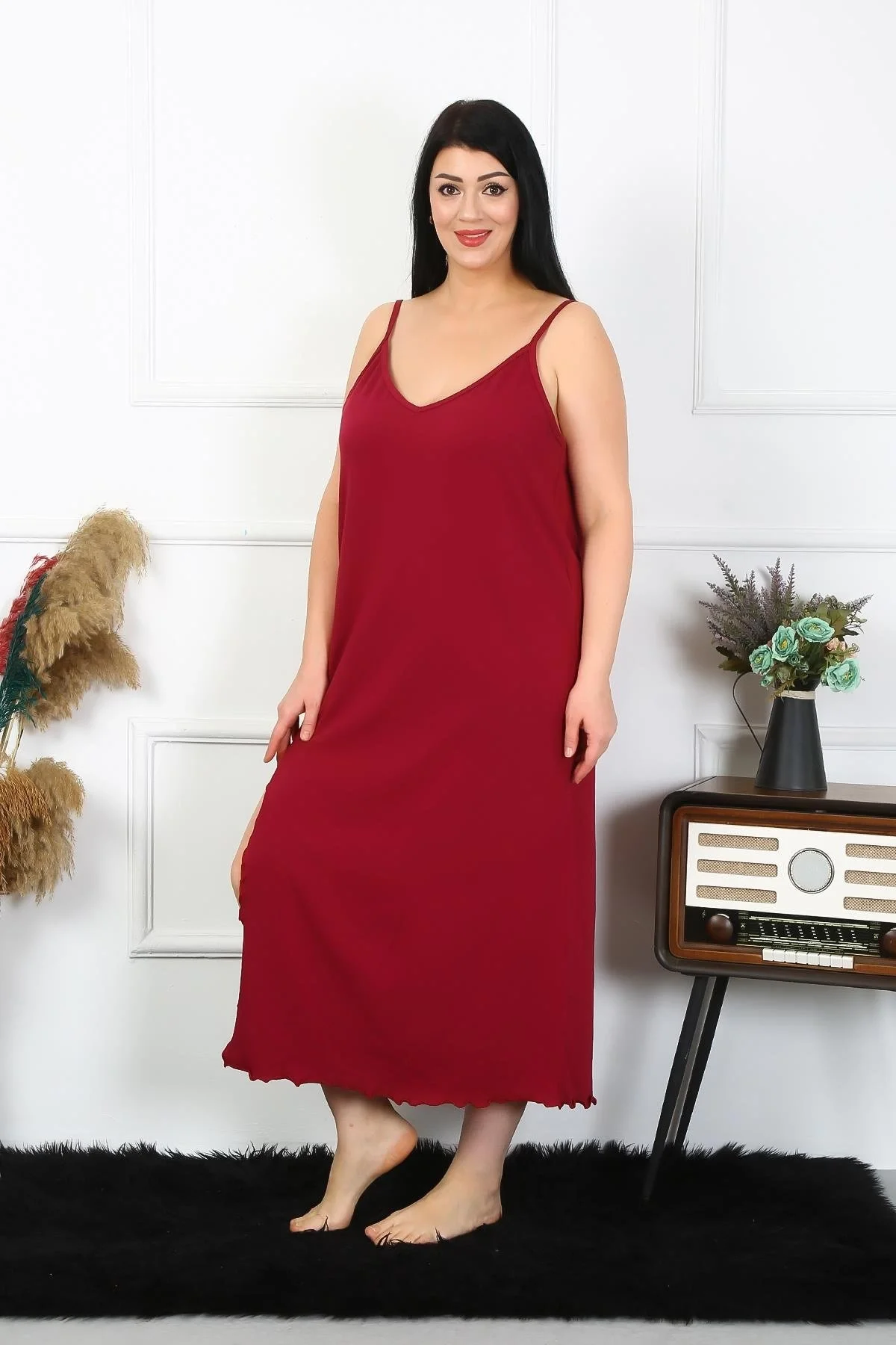 Çamaşır Kenti Kadın Büyük Beden İp Askılı Pamuklu Bordo Uzun Gecelik, rahatlığı ve şıklığı bir arada sunar.