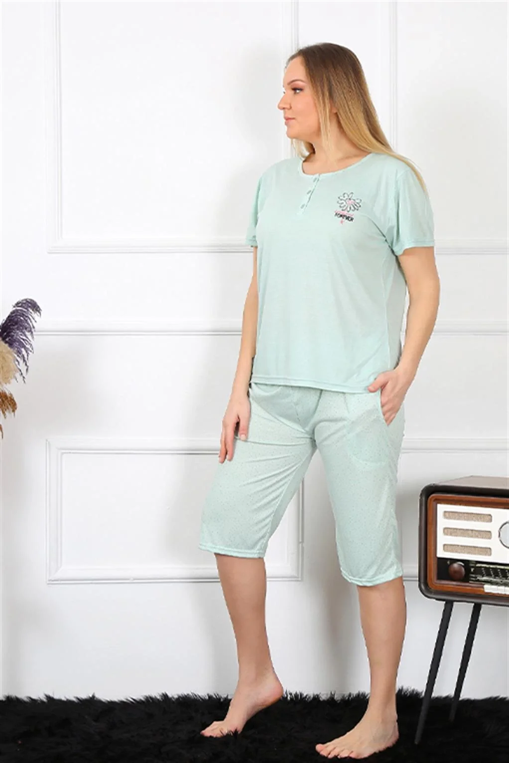 Çamaşır Kenti markasının şık ve konforlu bir seçeneği olan Kadın Büyük Beden Viscon Su Yeşili Kapri Pijama Takımı, hem rahatlığı hem de şıklığı bir arada sunar.