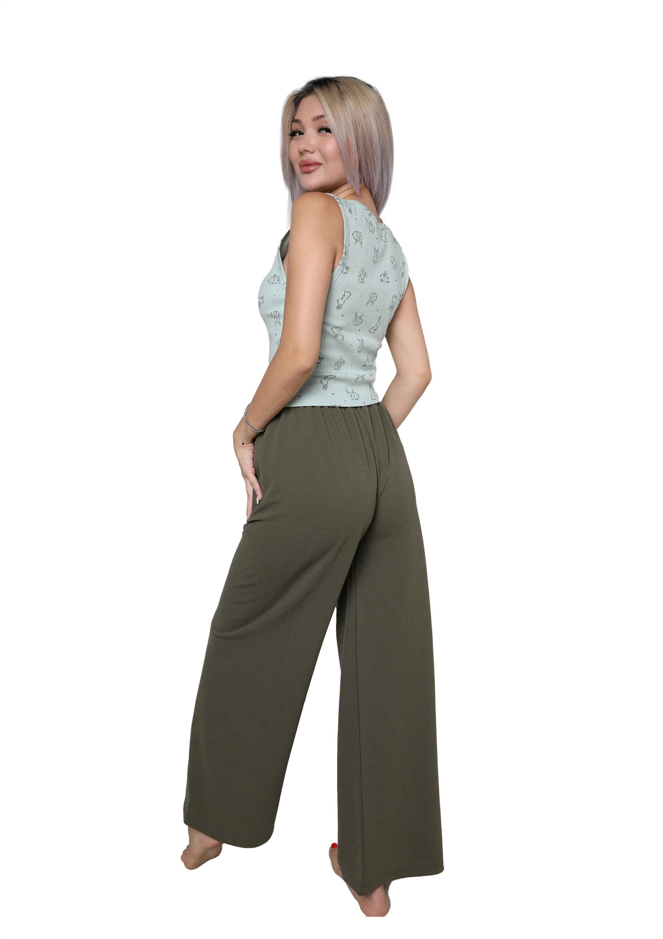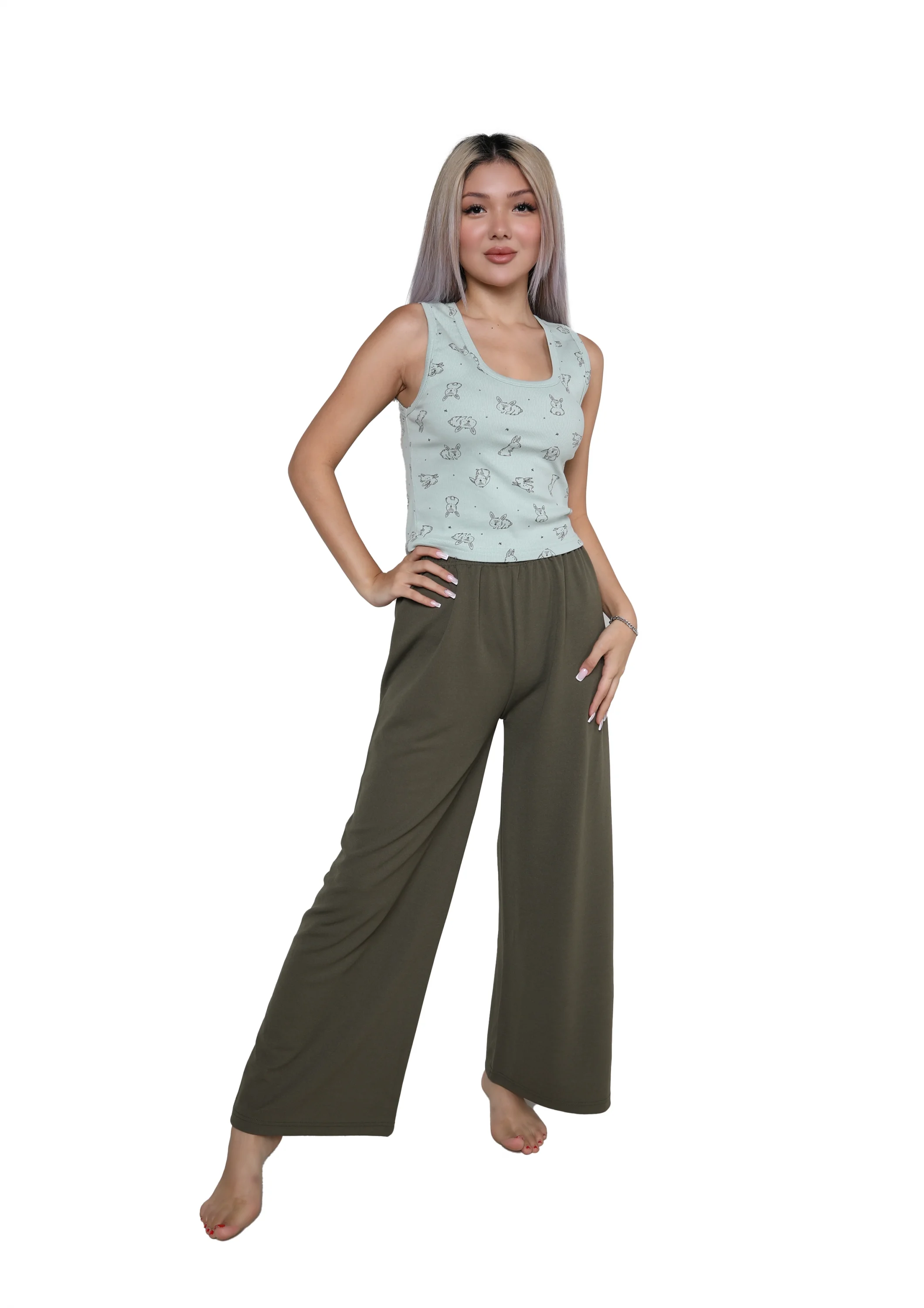 Bu harika takım ile her ortamda dikkatleri üzerinize çekmeye hazır olun. Çamaşır Kenti kalitesi ve şıklığı ile Kadın Kalın Askılı Body Bol Paça Pantolon 2'li Takım Su Yeşili, şimdi sizi bekliyor!