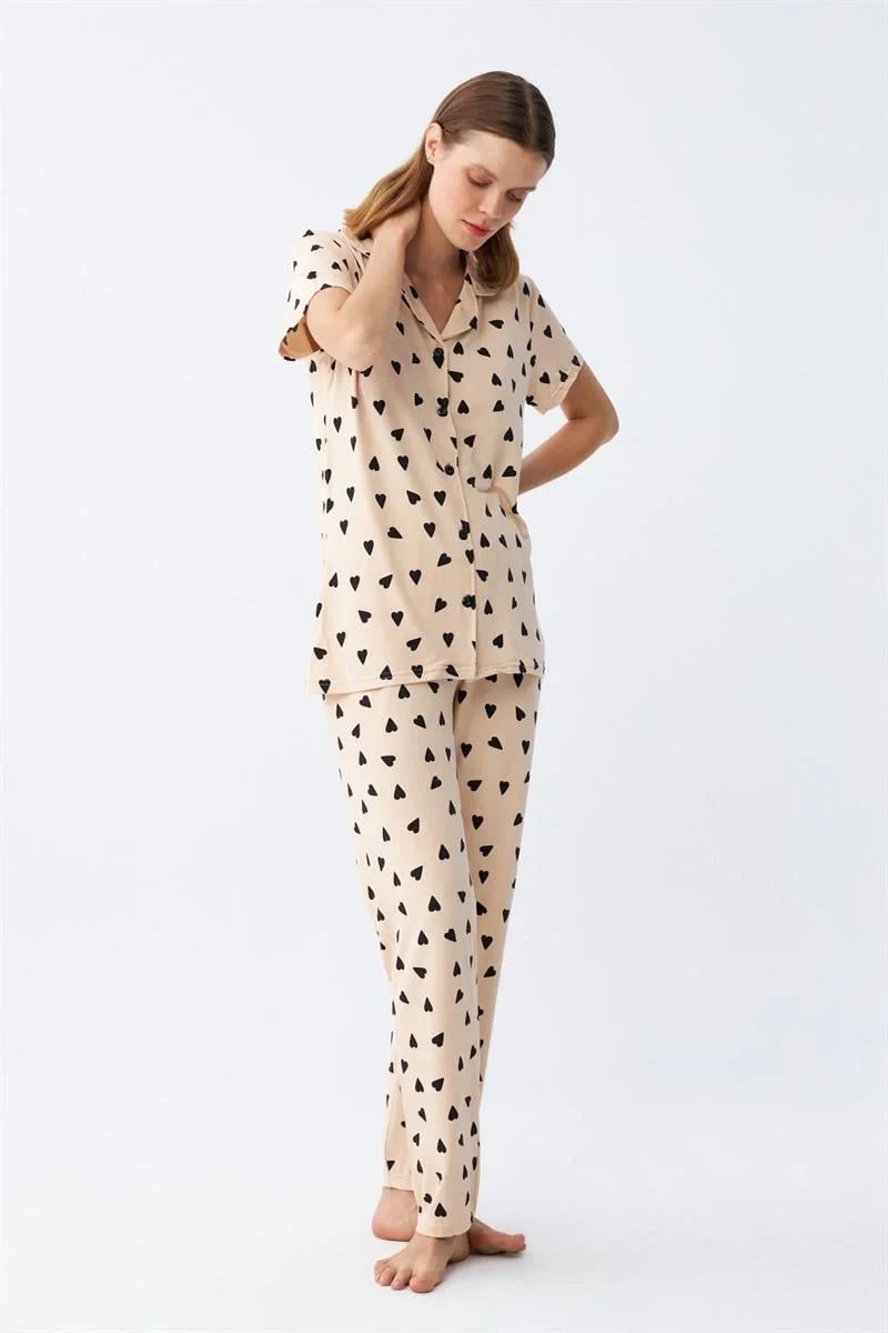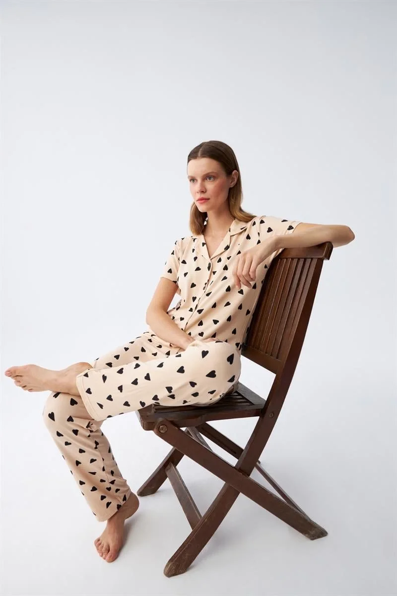 Çamaşır Kenti markasının özel tasarımı olan Kadın Krem Rengi Kalp Desenli Önden Düğmeli Pijama Takımı, kullanışlı ve şık bir seçenektir.