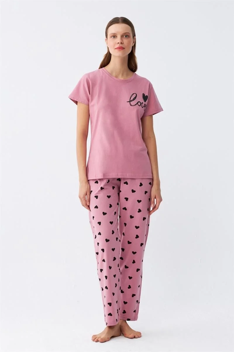 Çamaşır Kenti markasının şık ve rahat tasarımıyla ön plana çıkan Kadın Somon Kalp Desenli Kısa Kollu Penye Pijama Takımı, şıklığıyla göz kamaştırıyor.